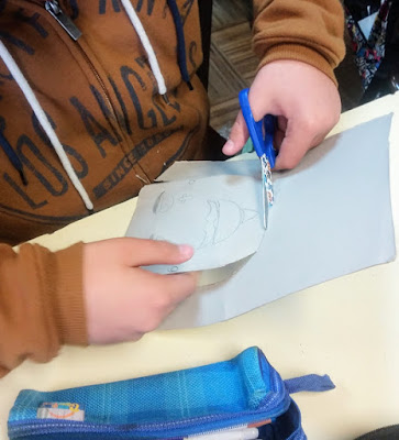 2- Recortaram o molde. Com a ajuda da professora foram recortados os olhos;